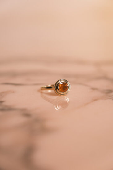 Discover the Signature Pinky Ring in 18k gold with a fiery Mandarin Garnet. A bold bespoke design celebrating passion, vitality, and creativity.