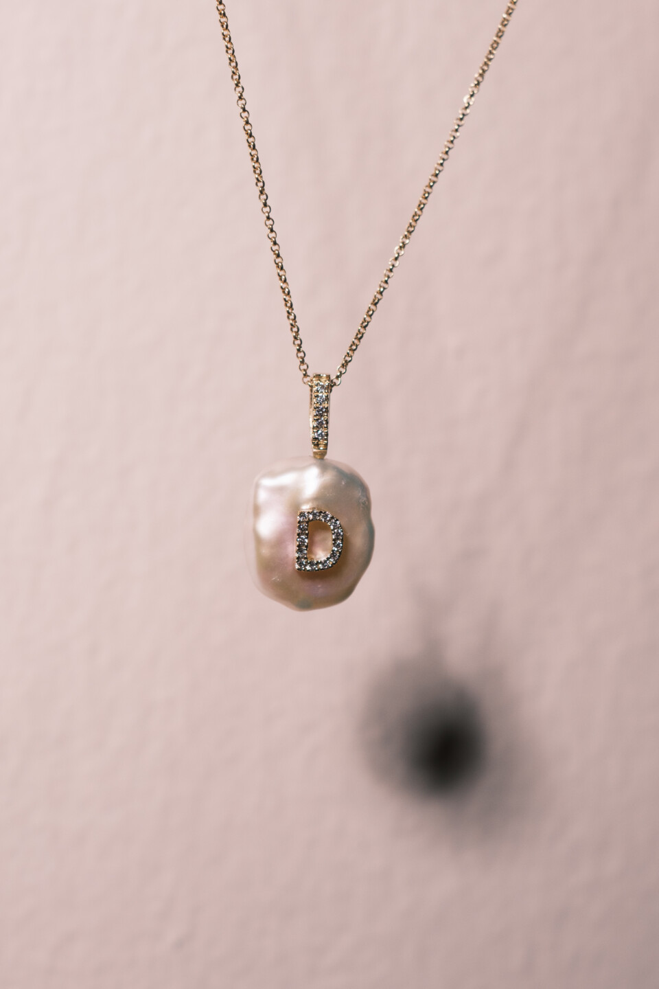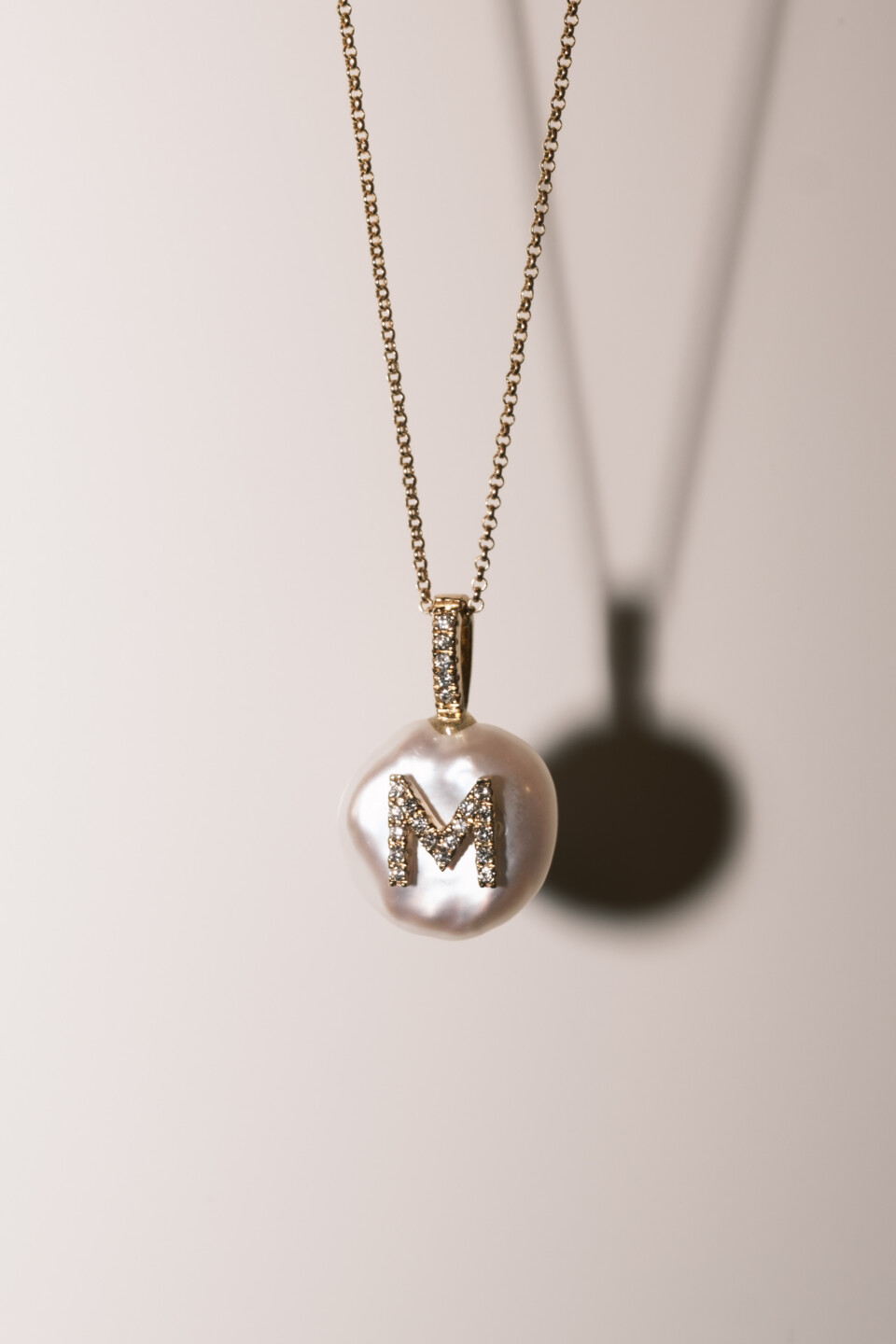 Honor the love you have for yourself or a special someone with our Diamond Letter Pearl Necklace. The initial is casted from 18Karat Yellow Gold and set with natural glimmering diamonds on a freshwater petal shaped pearl.